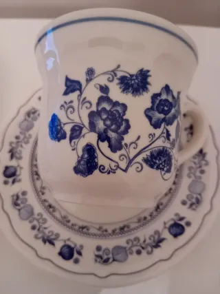 Elegante set composto da una tazzina da caffè con piattino e una ciotola, entrambi decorati con un motivo floreale blu su sfondo bianco. - Tazzina con manico. - Piattino coordinato. - Ciotola capiente. - Design floreale blu e bianco.
