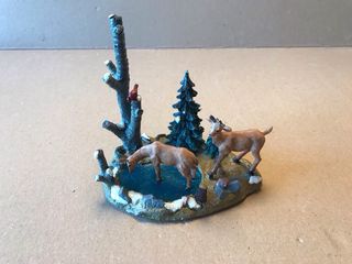 Scenetta Lemax Testing The Water codice 03337. Raffigura un paesaggio invernale con due cerbiatti vicino a uno specchio d'acqua. Non più in produzione: ritirato nel 2025 - Albero con uccellino rosso. - Albero di Natale innevato. - Base con rocce e vegetazione.
