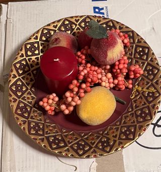 Elegante piatto centrotavola con decorazioni a tema frutta. - Design con motivi a cuore e rombi. - Finitura dorata e bordeaux. - Include elementi decorativi come mele, limone e bacche rosse.