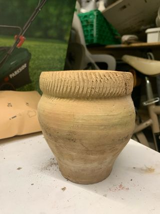 Mini.Vaso in terracotta con una decorazione a rilievo sul bordo superiore. La sua forma è panciuta e si restringe verso la base. - Materiale: terracotta. - Colore: beige e marrone. Piccola crepa visibile in foto perché molto datato