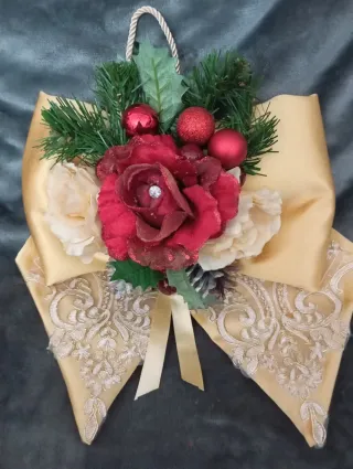 Bellissimo fiocco decorativo per le feste. - Fiocco in raso dorato con pizzo rebrodé panna oro ideale le rendere il Natale più magico con un tocco di eleganza - Ideale come decorazione da porta o puntale per l'albero di Natale. - Dettagli floreali rossi e dorati. - Elementi natalizi come pigne e palline rosse.