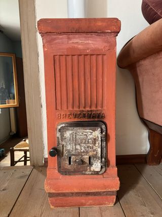 Stufa a legna dal design classico, della storica marca Becchi. Perfettamente funzionante, oltre al fascino vintage di un classico elemento d'arredo offre realmente un buon rendimento e basso consumo grazie alle finiture in terracotta che trattengono e irradiano il calore a lungo. - Struttura in terracotta e metallo. - Colore marrone e arancione. -Canali del fumo non compresi.