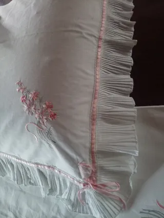 Set di lenzuola con graziosi ricami floreali e dettagli in pizzo. 250/280 federe 50/76 - Ricami floreali rosa. - Bordi con volant e nastro rosa. - Federe abbinate incluse.