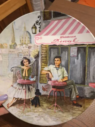 Piatto da collezione Ornamin con una scena cittadina. - Realizzato in plastica. - scena cittadina con due persone sedute a un caffè e cittadina sullo sfondo Diametro 24 cm Qualche piccolo segno sul retro ma nessuna sbeccatura o crepa