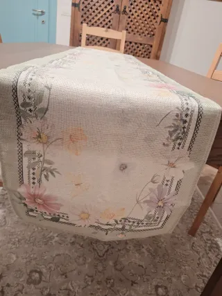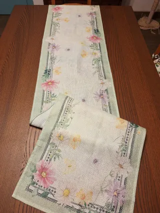 Elegante runner da tavola con una bellissima stampa floreale su sfondo verde chiaro. Perfetto per aggiungere un tocco di colore e stile alla tua tavola. - Design con fiori colorati e dettagli raffinati. - Realizzato in tessuto di lino quello a quadrettini tipo tela Aida Solo lavato e messo via