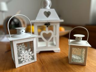 Set di tre lanterne decorative in metallo e vetro, perfette per creare un'atmosfera accogliente. - Design elegante con dettagli a cuore e fiocco di neve. - Ideali per candele o luci a LED.