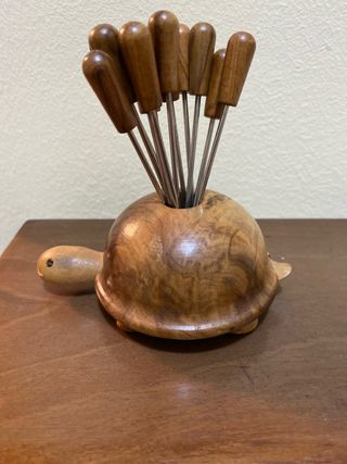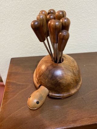 Set di forchettine per antipasti con base a forma di tartaruga in legno. - Base a forma di tartaruga in legno. - Include 6 forchettine con manico in legno e stelo in metallo.
