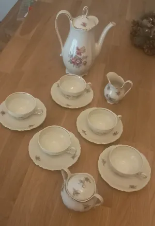 Elegante servizio da caffè in porcellana con decorazioni floreali. - Include caffettiera, zuccheriera, lattiera e cinque tazzine con piattini. - Design floreale colorato e raffinato. - Bordi dorati per un tocco di classe.