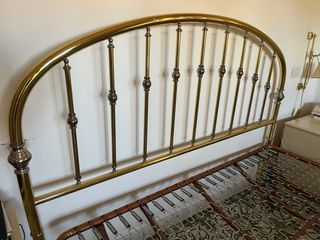 Vendo a Ostia: struttura letto in metallo dorato con rete inclusa, dimensioni 160x190 cm. - Design classico con testiera e pediera ad arco. - Rete a molle in metallo. Entrambi gli oggetti sono usati e con segni del tempo ma funzionanti. Ottimo per seconde case o appartamenti in affitto breve. Solo per ritiro, non posso consegnare o spedire. Vendibili anche singolarmente. Prezzo trattabile.