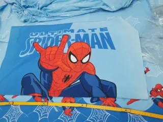 Completo lenzuola per letto singolo con il personaggio di Spiderman. Usato ma ancora bello da utilizzare, leggermente sbiadito il colore in alcuni punti, si vede nel dettaglio in foto, con confezione originale. Cotone - Fantasia Spiderman Ultimate Man. - Decorazioni con ragnatele. - Prodotto Caleffi.