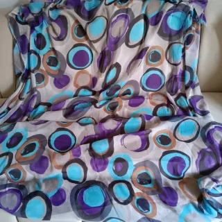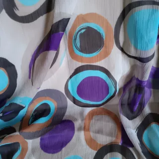 Tessuto in chiffon con una vivace fantasia di cerchi e ovali in diverse tonalità di viola, turchese e marrone. Ideale per creazioni sartoriali e accessori. - Dimensioni: 150 x 170 cm. - Materiale leggero e fluttuante.