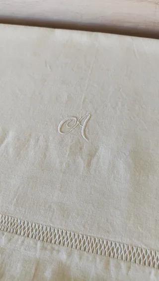 Lenzuolo per letto matrimoniale vintage, in puro cotone bianco naturale-sabbia (non sbiancato) dalla grammatura media, con orlo a giorno ricamato a mano lungo tutta la balza e monogramma con la lettera A. Il lenzuolo è stato lavato per il tempo trascorso, è in perfette condizioni. Un tocco di raffinatezza per la tua biancheria da letto. Misure Larghezza 230 cm Lunghezza 280 cm Peso 1,5 kg - Lavorazione ajour artigianale. - Tessuto in puro cotone di alta qualità.