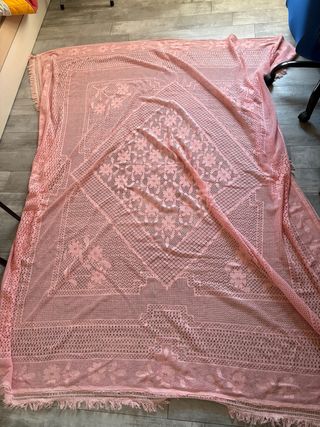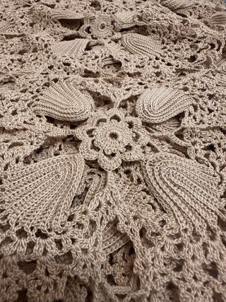 Elegante copriletto matrimoniale realizzato all'uncinetto con un motivo floreale. valore inestimabile ma preferisco venderla affinché qualcuno possa dargli nuova vita.. - Lavorazione artigianale. - Design a fiori. - Bordi rifiniti con dettaglio ondulato.