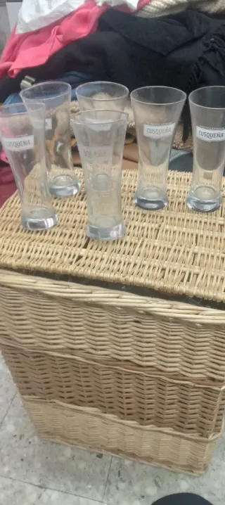 Set di sei bicchieri di vetro con il marchio Cusqueña. Design classico per la birra. Ideali per collezionisti o per godersi a casa.