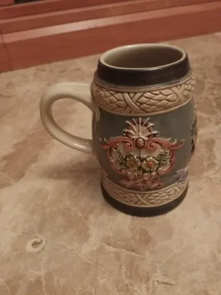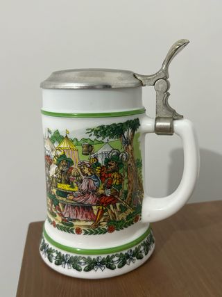 Brocca da birra in stile tedesco con un design tradizionale e dettagliato. Ideale per collezionisti o per gustare una bevanda. Il disegno è una scena medievale/rinascimentale tipica degli stein decorativi del XX secolo. - Decorazione con scena festiva. - Coperchio in metallo con maniglia. - Base con motivi decorativi.