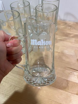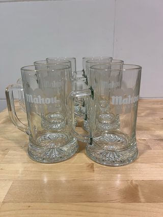 Set di 16 bicchieri da birra del marchio Mahou, perfetti per collezionisti o amanti della birra. Design con illustrazioni a tema. Realizzati in vetro trasparente. Si vendono separatamente a 2 euro o tutto il lotto a 25 euro.