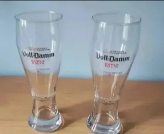 Set di due bicchieri di birra della marca Voll-Damm. Altezza 20 cm. Design alto e stilizzato. Incisione Doble Malta in rosso. Base spessa per maggiore stabilità.