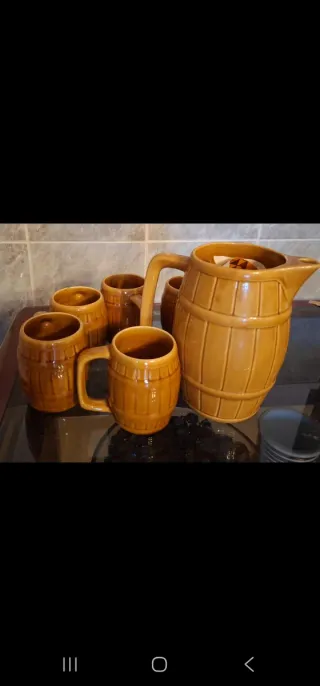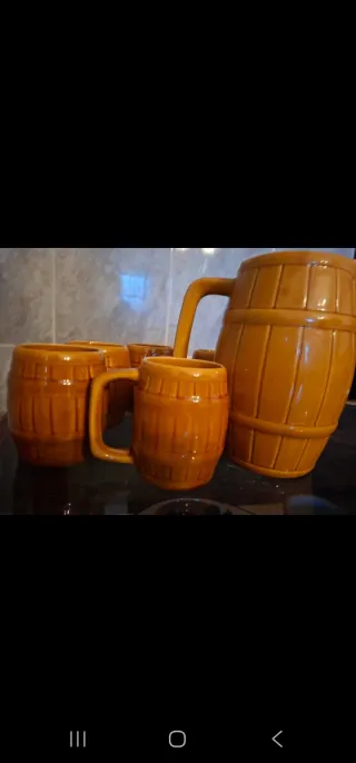 Set di brocca e bicchieri da birra con un design vintage. - Brocca con manico e beccuccio svasato. - Quattro bicchieri abbinati. - Design ispirato ai barili.