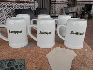 Set di sei caraffe vintage in ceramica bianca per birra con il logo di San Miguel. Capacità di circa 50 cl. Design classico ed elegante. Ideali per gustare la tua birra preferita. Materiale: ceramica.