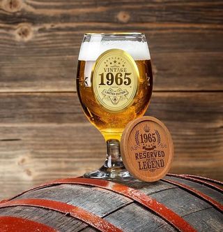 Set regalo commemorativo dell'anno 1965. - Bicchiere in vetro con design vintage 1965. - Portachiavi metallico con dettagli. - Apribottiglie Legend's Power Est. 1965. - Base in legno Reserved for the Legend con design di alloro e corona. *1717*