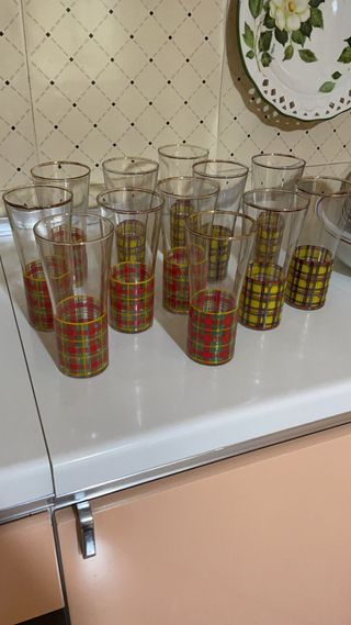 Set di 12 bicchieri da birra con un vivace design a fantasia tartan. - Fantasia tartan rossa, gialla e verde. - Bordo superiore dorato. - Ideali per servire birra o altre bevande.
