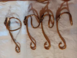 Set di quattro appendiabiti in ottone dallo stile vintage. Questi ganci presentano un design curvo con dettagli decorativi. - Realizzati in metallo color oro. - Design a forma di gancio con ricciolo finale. - Decorazioni floreali alla base del gancio.