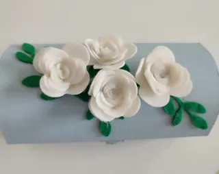 Elegante scatola portagioie in legno, perfetta per conservare i tuoi gioielli. - Decorata con delicate rose bianche in pannolenci. - Dettagli floreali verdi. - Finitura esterna azzurra.