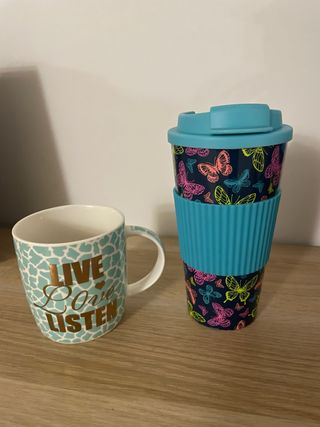 Set composto da una tazza in ceramica e una tazza da viaggio con coperchio. - Tazza in ceramica con fantasia - Tazza da viaggio con fantasia di farfalle colorate e con guaina in silicone.