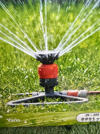 Irrigatore circolare Vario con base a slitta per un facile spostamento. - Base a slitta per stabilità e mobilità. - Design circolare per un'irrigazione a 360°.