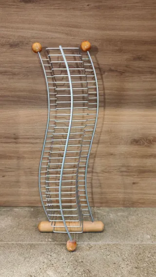 Elegante porta CD con un design a onda unico. La struttura in metallo argentato si integra perfettamente con le finiture in legno chiaro, creando un pezzo d'arredo funzionale e di stile. - Struttura in metallo argentato. - Dettagli in legno naturale. - Forma sinuosa e moderna.
