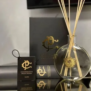 Elegante profumatore per ambiente con bastoncini. - NUOVO, SIGILLATO - Ottima idea regalo - Fragranza Fruity Blend. - Vaso rotondo in vetro trasparente. - Dettagli dorati sul vaso e sulla confezione I diffusori di profumo per ambiente "Cooperativa Profumieri", con bastoncini in legno naturale, si integrano con stile e discrezione in ogni ambiente, regalando una profumazione delicata e duratura. La fragranza, contenuta in un elegante e raffinato packaging, viene profusa attraverso i bastoncini che, immersi nel profumo, la assorbono per capillarità, la trasportano verso l'alto e la rilasciano in modo uniforme e costante.