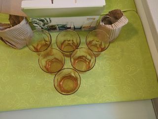 6 bicchieri da pasto nuovi mai usati in vetro. Colore ambrato sfumato. Bicchieri integri e confezione originale integra. Dimensioni come da foto allegate.
