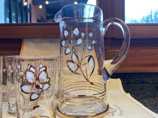 Splendido servizio vintage composto da 6 bicchieri e una caraffa abbinata, risalente agli anni ’40, regalo di nozze d’epoca. Realizzato in vetro trasparente decorato a mano con eleganti motivi floreali bianchi e profili in autentico oro zecchino, che ne impreziosiscono il valore. Dettagli: • Epoca: anni ’40 • 6 bicchieri + 1 caraffa con manico • Decori floreali smaltati a mano • Rifiniture in vero oro zecchino • Condizioni eccellenti, da collezione