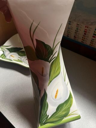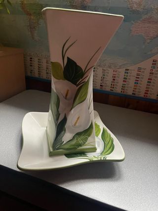 Bellissimo set composto da un vaso alto e un piatto decorativo. Entrambi sono in ceramica, con decorazioni floreali eleganti in verde e bianco. Perfetti come centrotavola o elementi d'arredo. Sono in ottime condizioni. - Misure vaso: 30 cm di altezza, apertura quadrata 13x13 cm - Misure piatto: 23x23 cm