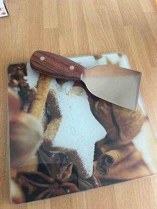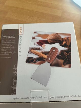 Tavola da cioccolato in vetro di BRANDANI, con coltellino in acciaio inox. Perfetta per fondere e lavorare il cioccolato. - Elegante tagliere in vetro. - Coltello in acciaio inox incluso. - Manico in legno pregiato.