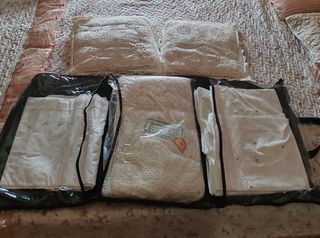 Bellissimo completo letto matrimoniale in cotone bianco, con raffinato copriletto in pizzo. - Include lenzuola, federe e copriletto. - Il pizzo è lavorato a mano ed è in ottime condizioni. - Perfetto per una camera da letto elegante e romantica. - 2 copricuscini in pizzo inclusi.