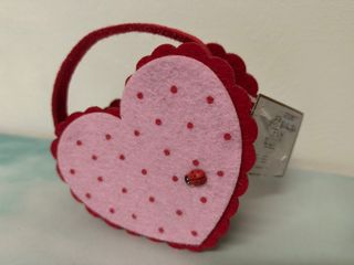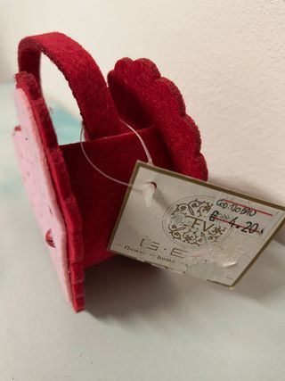 Bellissimo cestino a forma di cuore, realizzato in feltro di colore rosso e rosa. Perfetto per bomboniere o piccoli oggetti. - Dimensioni contenute. - Decorato con pois e coccinella. Misura 9 x 9 x 5 cm. Con il manico arriva a 11 cm di altezza