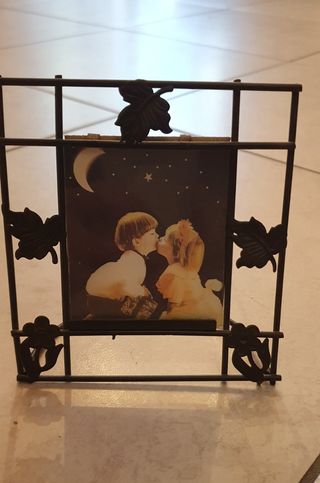 Romantica cornice in metallo con decorazioni. - Decorazioni a forma di foglia. - Dettagli floreali alla base.
