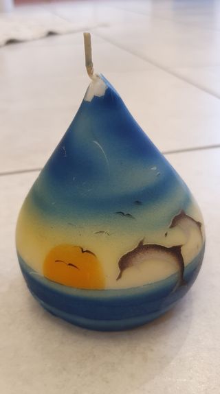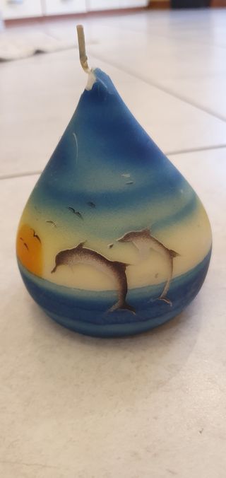 Candela a forma di goccia con una decorazione marina. - Raffigurazione di delfini che saltano fuori dall'acqua. - Tramonto con uccelli in volo. - Gradazioni di colore blu e giallo.