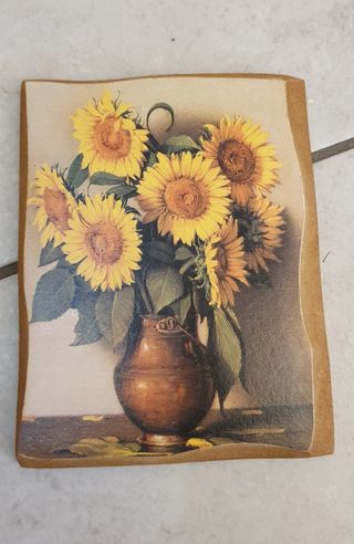 Bellissimo quadretto decorativo con un bouquet di girasoli in un vaso di rame. - Raffigurazione di girasoli. - Vaso in stile antico. - Colori vivaci e dettagli curati. - dimensioni 10x 13cm