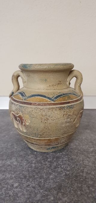 Vaso etnico in ceramica con decorazioni. - Design unico con motivi colorati. - Manici laterali. - Base stabile.