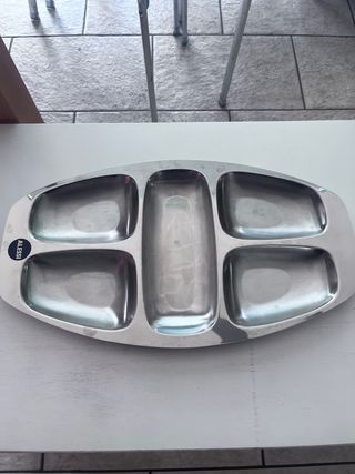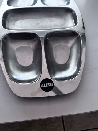 Vendo elegante vassoio originale Alessi in acciaio inox lucido, con 5 scomparti. 🔹 Dimensioni: 45 x 25 cm 🔹 Materiale: acciaio inox 🔹 Design moderno e funzionale, ideale come centrotavola, porta snack, aperitivi o antipasti 🔹 Condizioni: ottime