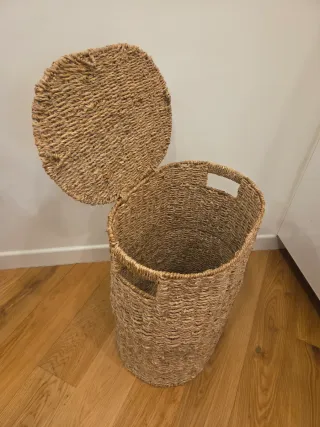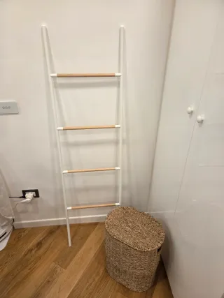 Set composto da un porta asciugamani e una cesta portabiancheria. - Porta asciugamani con struttura bianca e barre in legno. - Cestino in materiale intrecciato.