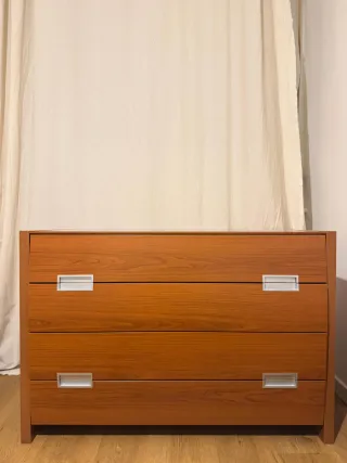 Elegante cassettiera vintage con un design moderno e finitura in legno. - Cassettiera a tre cassetti. - Maniglie in metallo argentato. - Linee pulite e geometriche.