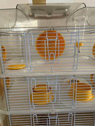 Gabbia per criceti a tre piani con accessori inclusi. - Struttura trasparente con dettagli gialli. - Include accessori come ruota e beverino. Misure corrette sono 30,5x19,5x42,5