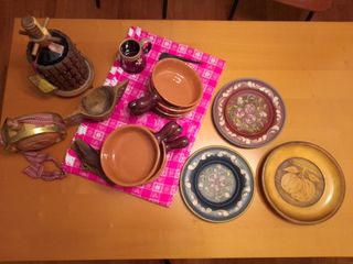 Set di oggetti decorativi per la casa, perfetti per un'atmosfera di montagna: 8 ciotole in terracotta, tovaglia in tessuto lavorato, portaoggetti in legno intagliato, portabottiglia di legno con boccale in ceramica smaltata, 3 piatti di legno 2 dipinti e uno intagliato, portalettere di legno dipinto a motivi floreali. - Piatto in legno intagliato con mele. - Piatto decorato con fiori. - Piatto decorato con fiori. - Tazza in ceramica decorata. - Mestolo in legno. - Porta bottiglia in legno. - Nastro decorativo.