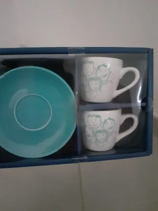 Set di due tazzine da caffè con piattini abbinati, perfette per gustare un espresso. - Design con simpatici volti stilizzati. - Un piattino di colore turchese. - Due tazzine bianche decorate.