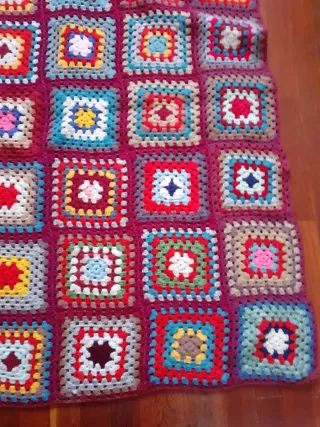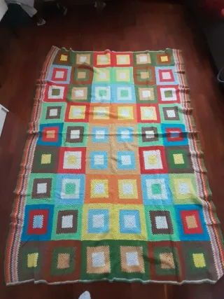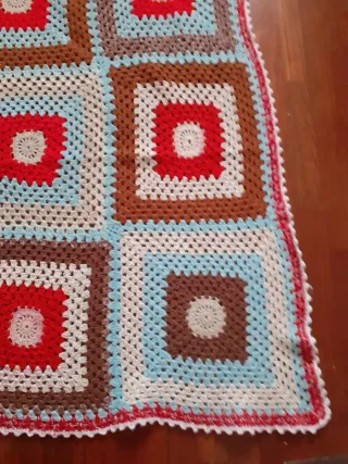 Coperta realizzata a mano con filato di lana, perfetta per aggiungere un tocco di calore e colore alla tua casa. 130x120 cm - Design a quadri concentrici. - Bordi rifiniti con cura.