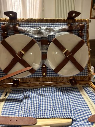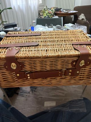 Elegante set da picnic in vimini, perfetto per gite all'aperto. - Capienza per 2-4 persone. - Include un pratico frigorifero per mantenere freschi cibi e bevande. - Rifiniture in pelle per un tocco di classe.