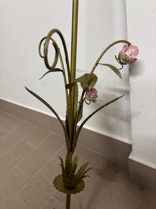 Delicata struttura per lampadario in ferro battuto, con dettagli floreali in ceramica. Lavoro artiginale - Finitura dorata con accenti rosa. - Design elegante a forma di fiore e boccioli.